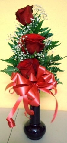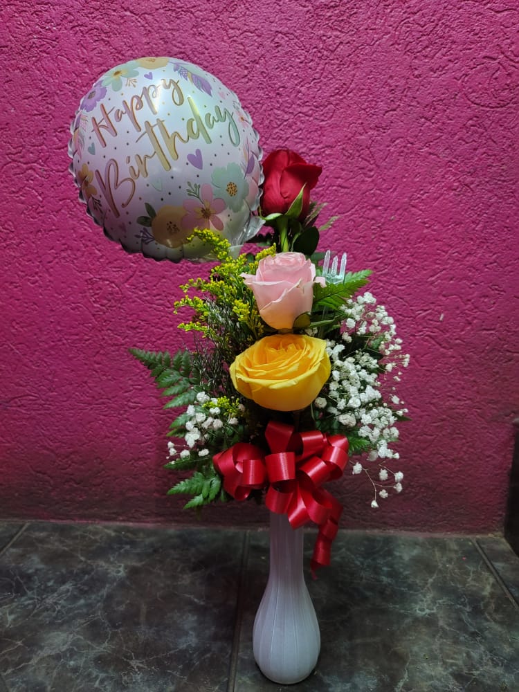 3 Roses arranged in a vase. Roses colours are only available in mixed colours such as purple, white, pink, yellow and orange.* Does not include balloon