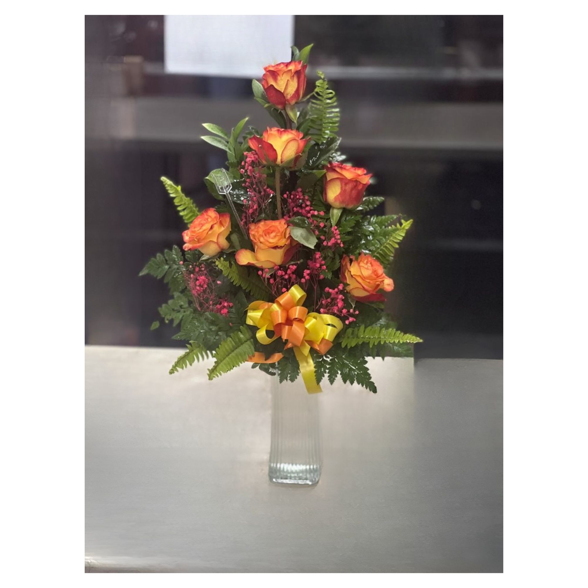 6 Roses arranged in a vase. Roses colours are only available in mixed colours such as purple, white, pink, yellow and orange.