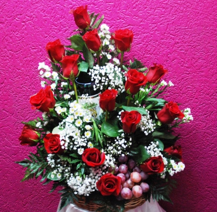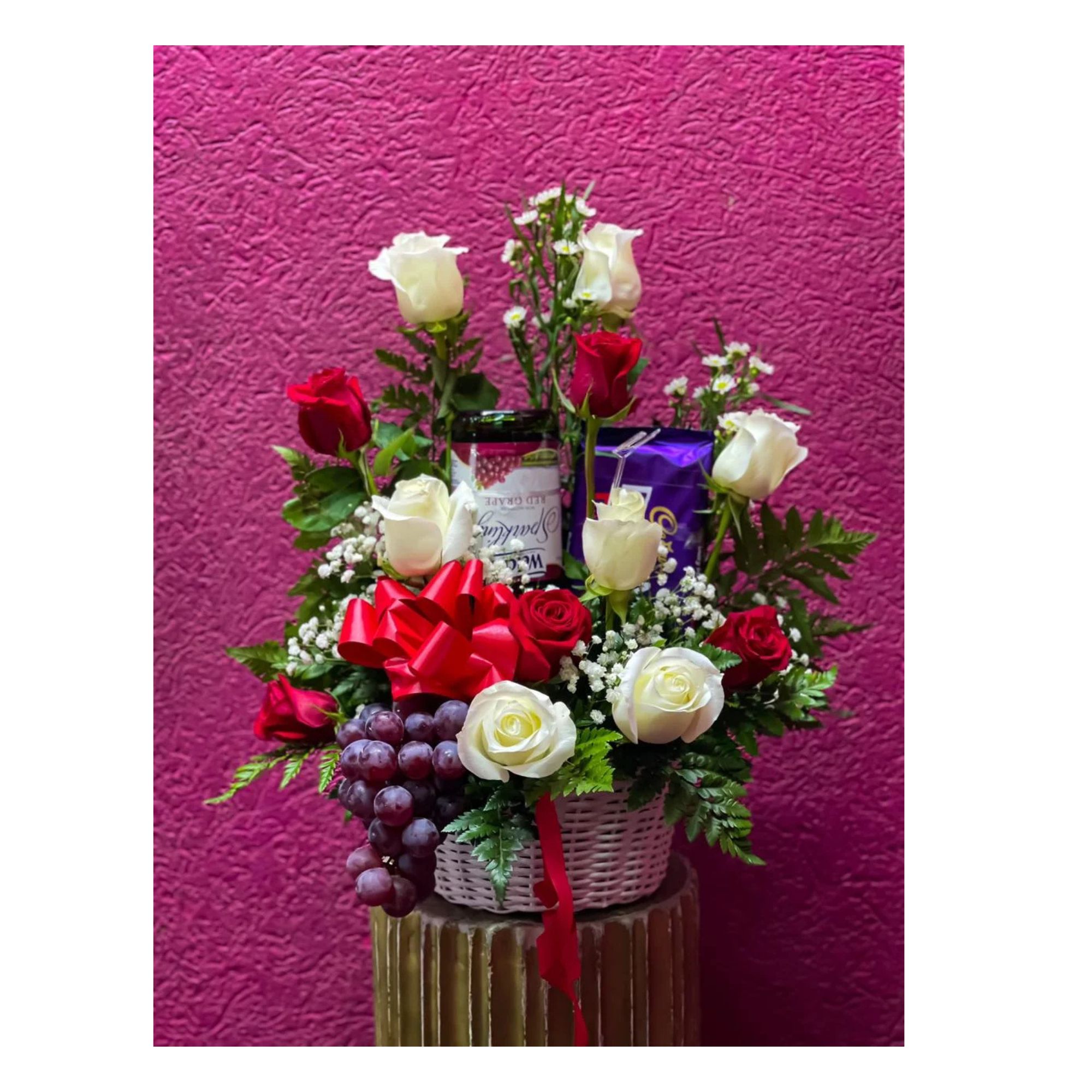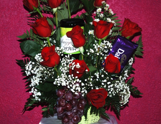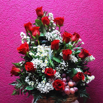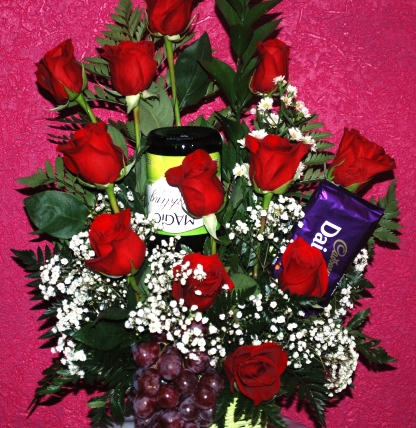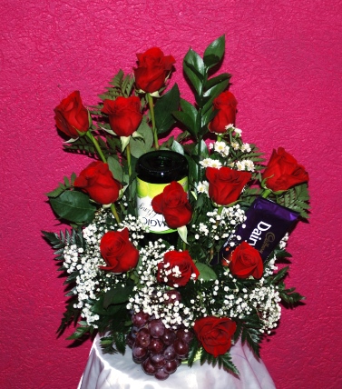 A bouquet and more!! 12 roses, wine and chocolate is the perfect way to say I Love You. Wine will be non-alcoholic sparkling wine. Order can also be customized with your own color scheme and additional gift items. Roses colours are only available in mixed colours such as purple, white, pink, yellow and orange.