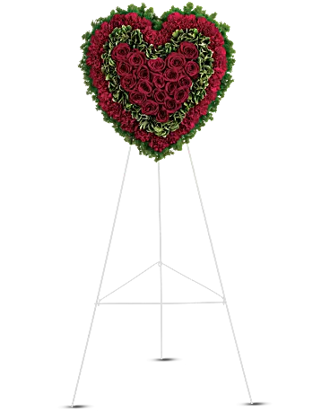 • Red carnations, red roses, variegated pittosporum and ming fern are arranged into a touching heart design that’s presented on a wire easel.