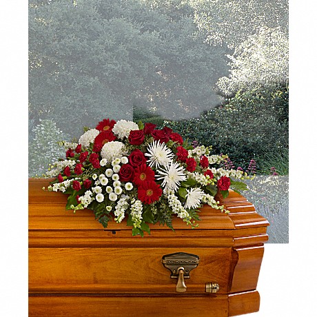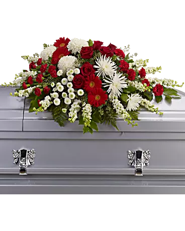 This lovely mix of flowers such as red roses, gerberas and carnations is balanced by white chrysanthemums and larkspur set against an assortment of greens including eucalyptus, salal, and leatherleaf fern to create a strikingly beautiful casket spray.