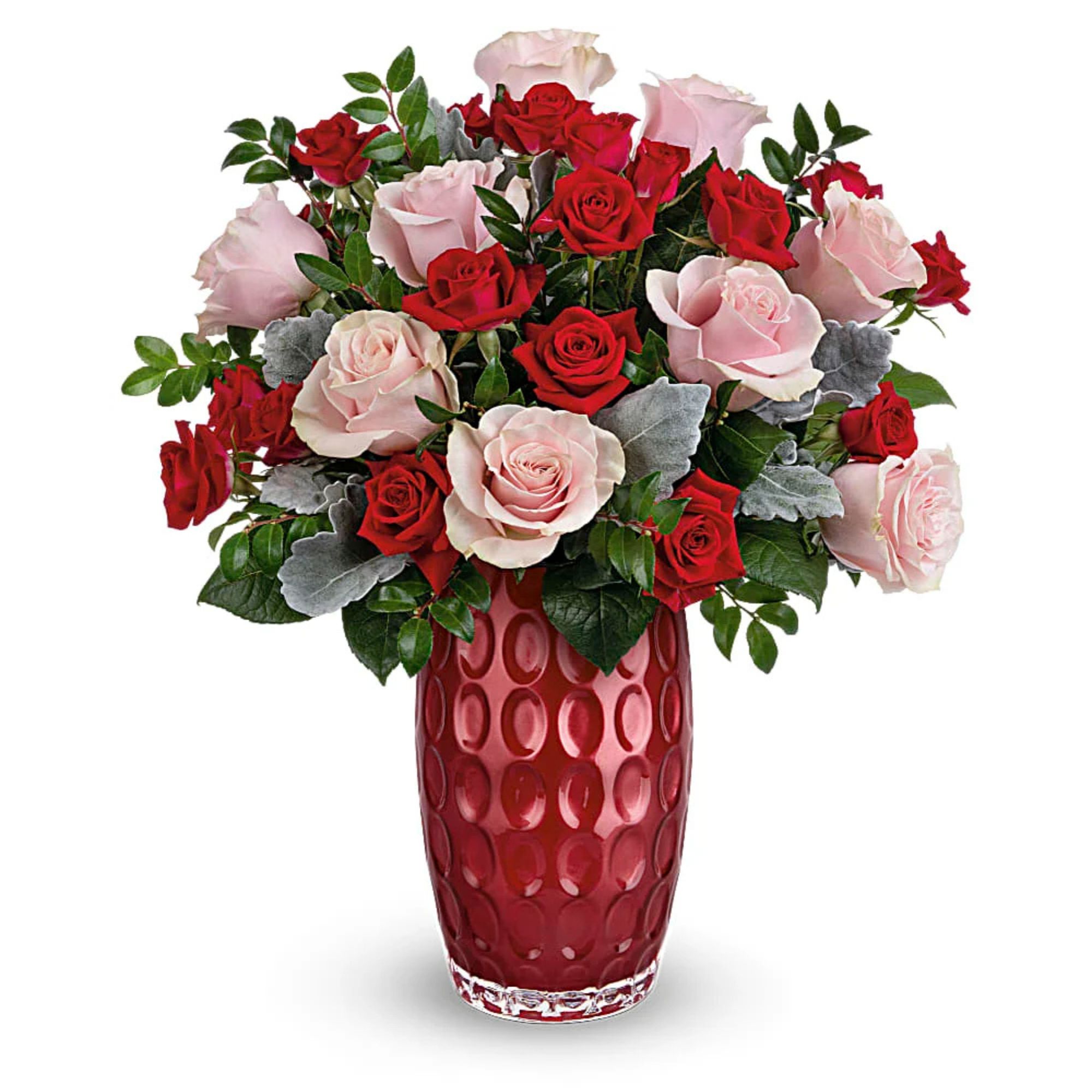A timeless expression of love, this elegant bouquet features lush red spray roses and soft pink roses, beautifully accented with dusty miller and fresh ferns. Arranged in a striking red vase, it’s a romantic gift that makes a bold yet graceful statement for any special occasion.