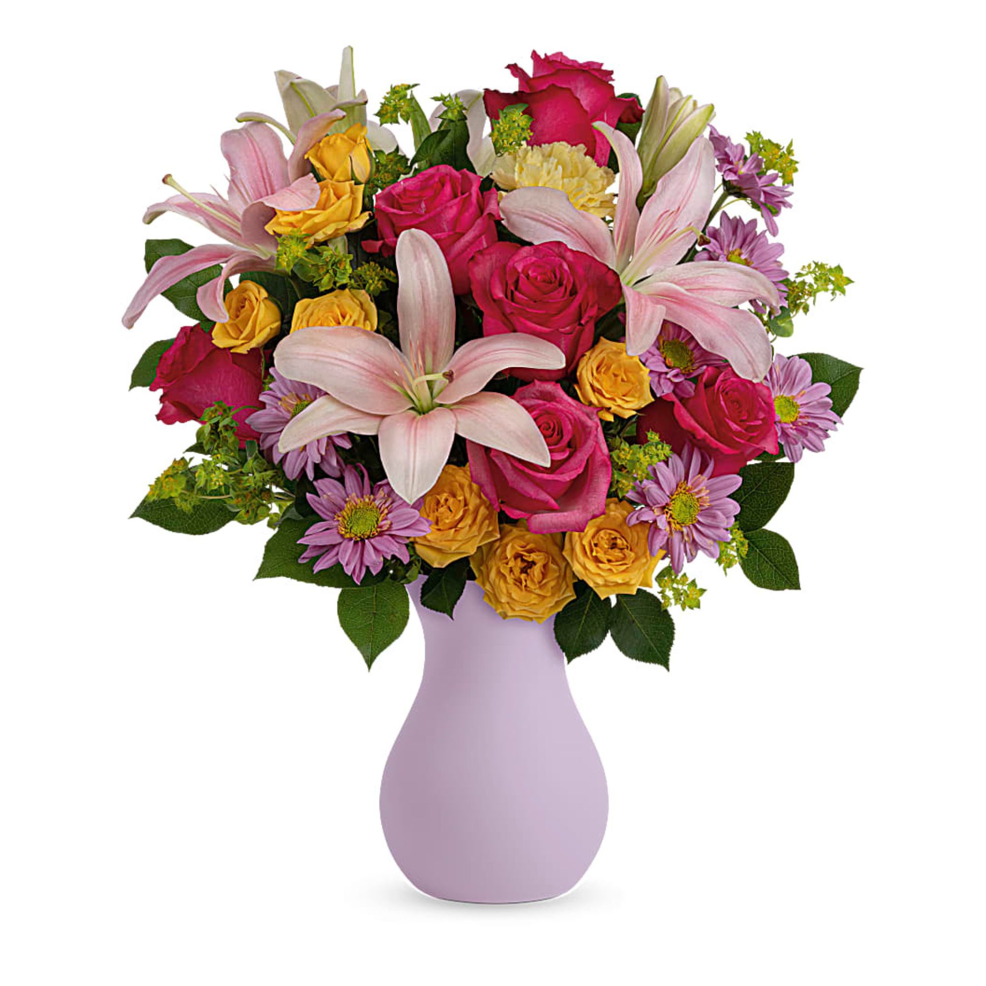 Impressionistic and impressive, this gorgeous bouquet of pastel flowers in a stunning lavender vase is a work of floral art. You know who would appreciate it. Surprise them.