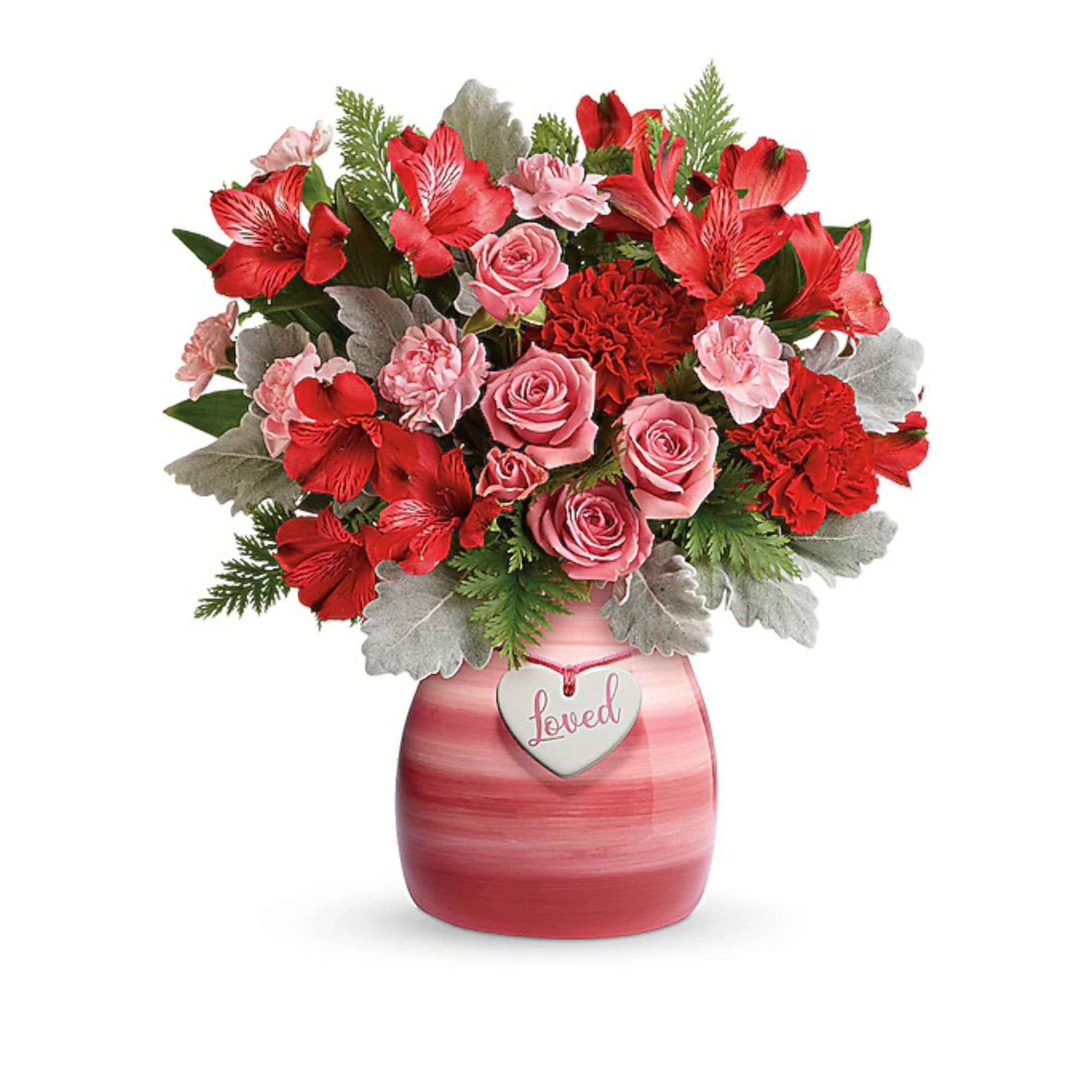 This bouquet features pink spray roses, red alstroemeria, red carnations, pink miniature carnations, dusty miller, and leatherleaf fern. Delivered in a Playfully Pink vase.