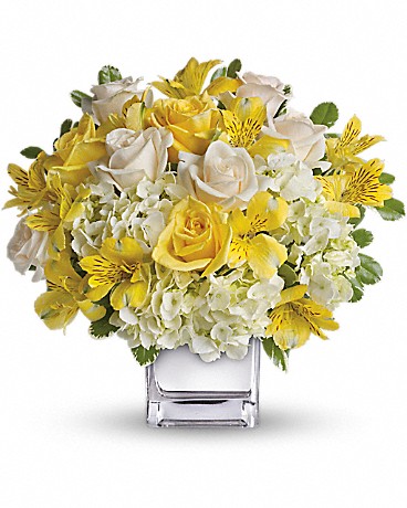 Even if she’s already in a great mood, this cheerfully charming bouquet will boost her spirits to the sky. Yellow roses, crème roses and other favorites in a sleek silver cube vase – irresistible!